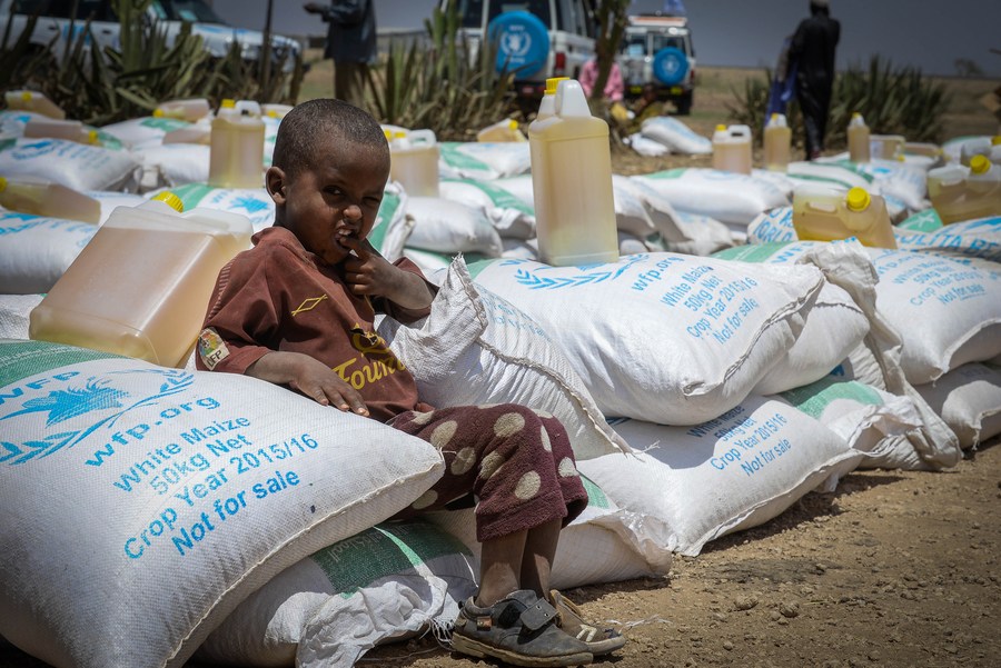 A boy waits for the relief food to be distributed in Harores Wereda, Southeastern Ethiopia, April 12, 2017. (Xinhua/Michael Tewelde)