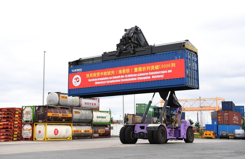 This photo taken on July 11, 2022 shows a scene from the welcome ceremony for the 10,000th trip made by China-Europe freight trains operated by the China-Europe Railway Express (Chongqing) in Duisburg, Germany. (Xinhua/Ren Pengfei)