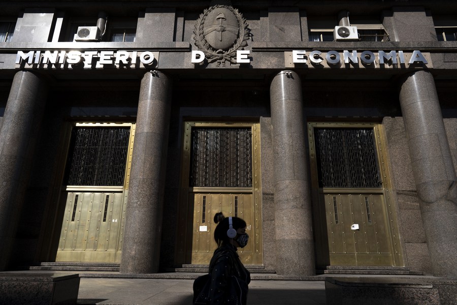 A woman passes by the building of Argentina's Economy Ministry in Buenos Aires, Argentina, Aug. 4, 2020. (Photo by Martin Zabala/Xinhua)
