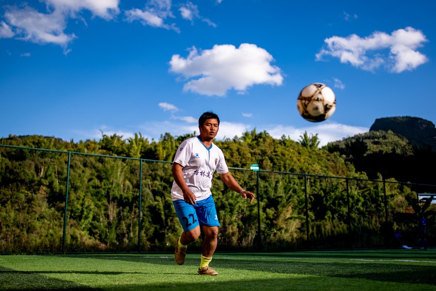 Bao Zhikun, the first captain of the football team of Longnai Village, warms up on the futsal pitch in Longnai Village, Cangyuan Wa Autonomous County of southwest China's Yunnan Province, Dec. 7, 2022. (Xinhua/Jiang Wenyao)