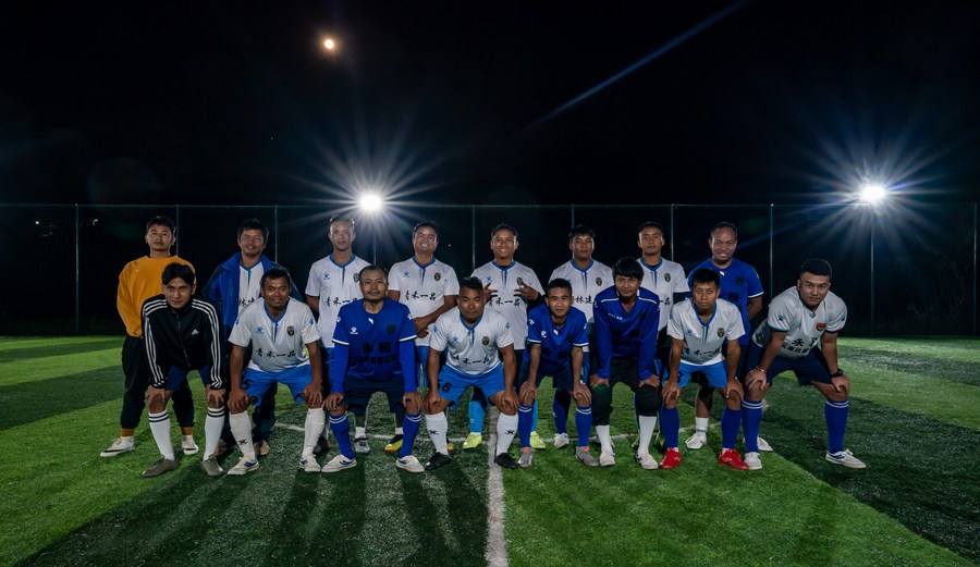 Members of the football teams of Longnai Village and Yonghe Village pose for a group photo after a match in Cangyuan Wa Autonomous County of southwest China's Yunnan Province, Dec. 7, 2022. (Xinhua/Jiang Wenyao)