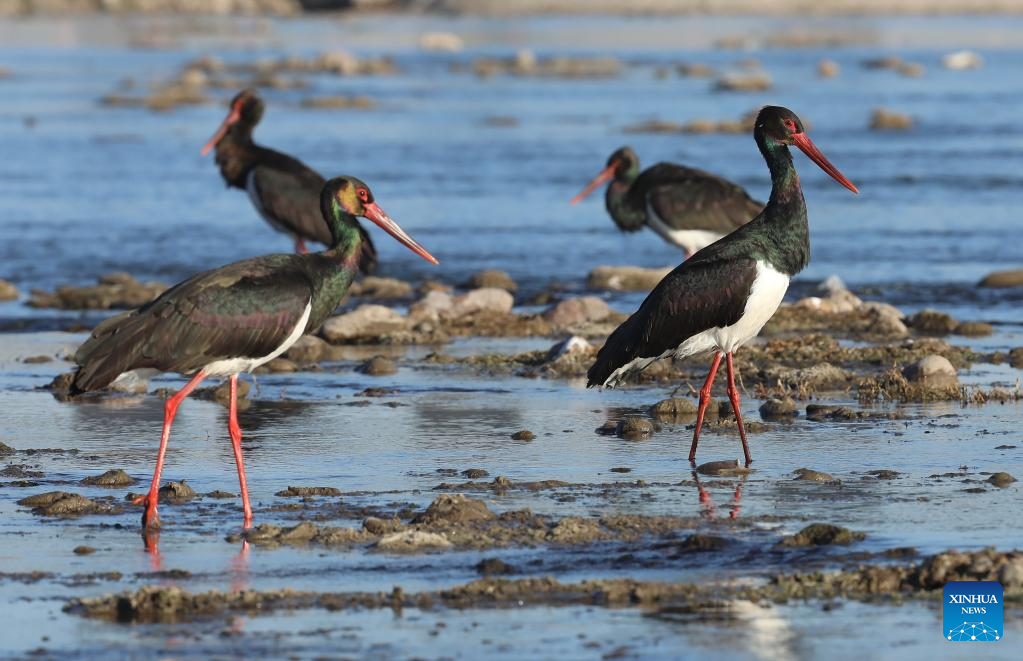 Black storks forage at Mianman River in Jingxing County, north China's Hebei Province, Dec. 22, 2022. Black stork is a migratory bird species under first-class national protection in China. There are fewer than 1,000 remaining in East Asia. (Xinhua/Yang Shiyao)