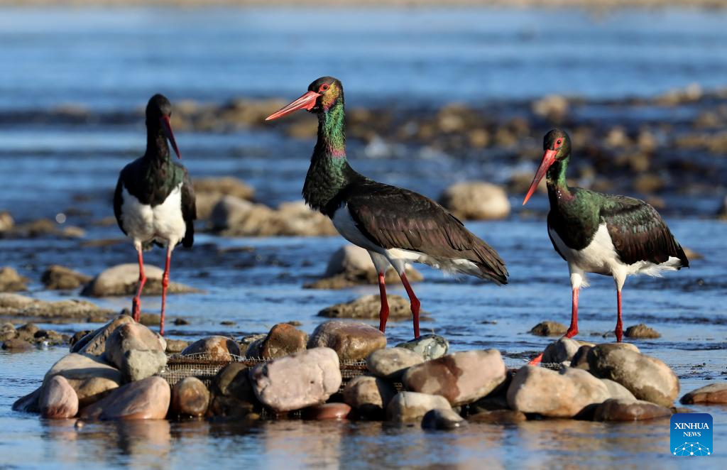 Black storks rest on stones by Mianman River in Jingxing County, north China's Hebei Province, Dec. 22, 2022. Black stork is a migratory bird species under first-class national protection in China. There are fewer than 1,000 remaining in East Asia. (Xinhua/Yang Shiyao)