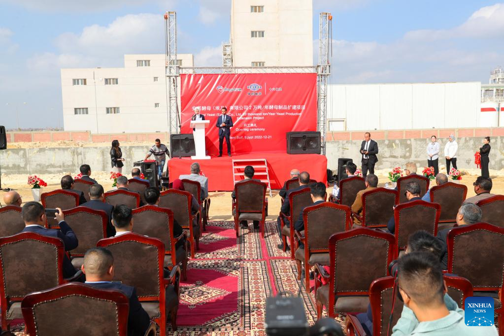 This photo taken on Dec. 21, 2022 shows the opening ceremony of the yeast production extension project of Angel Yeast Egypt, a subsidiary of a leading Chinese company in the yeast industry, in a factory located in the industrial zone in Beni Suef city in Middle Egypt. (Xinhua/Sui Xiankai)