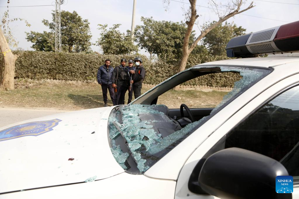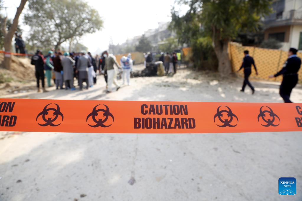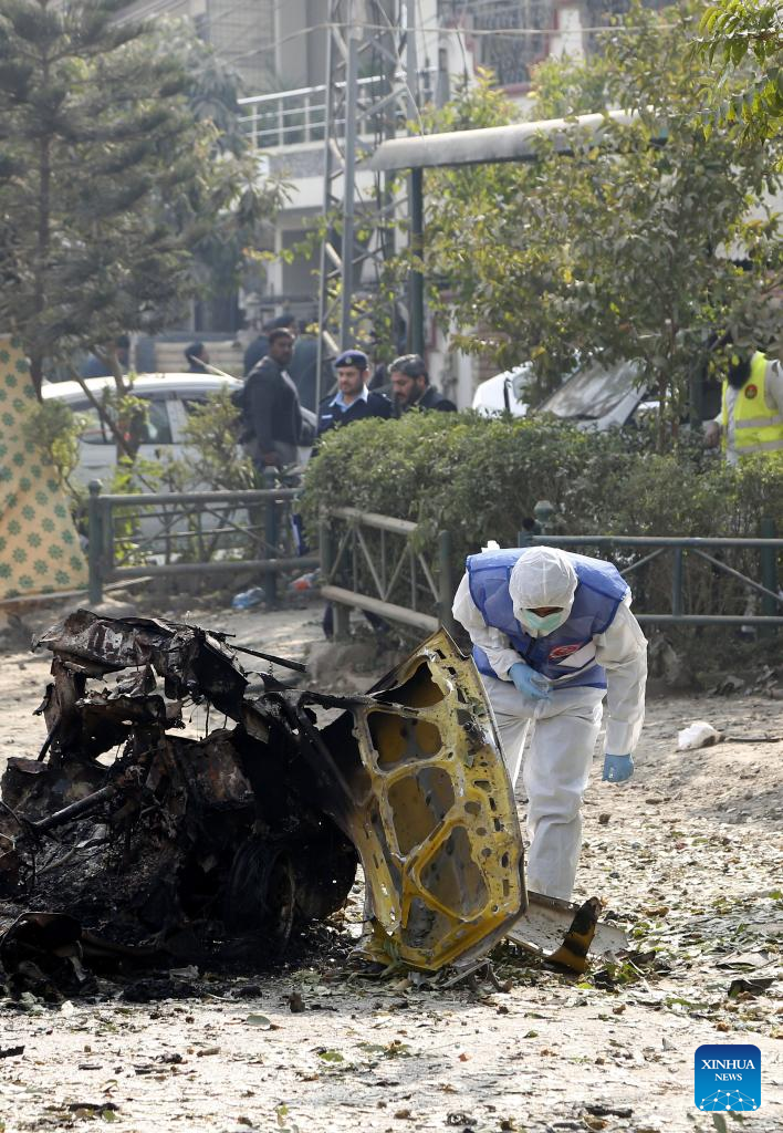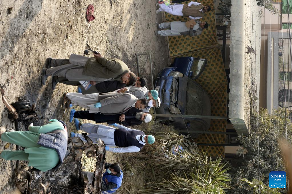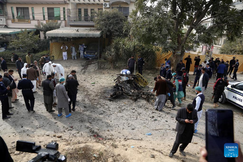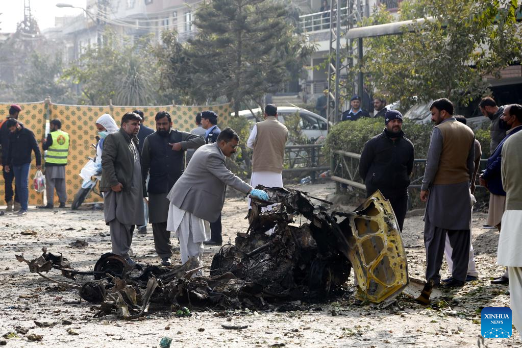 Security personnel investigate at the site of a suicide attack in Pakistan's capital Islamabad on Dec. 23, 2022. A policeman was killed and five others including three policemen injured in a suicide attack here on Friday morning, Islamabad police said in a statement. (Xinhua/Ahmad Kamal)