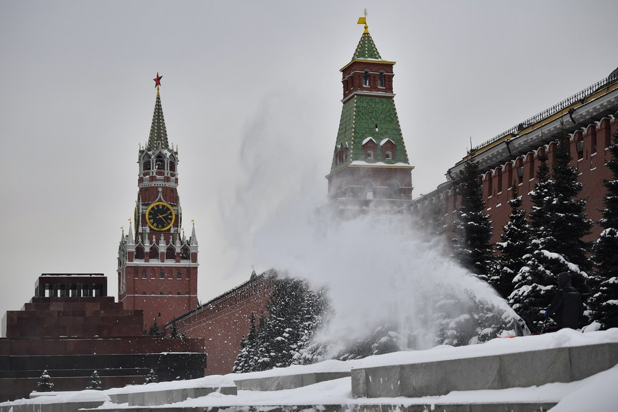 A worker removes snow at the Red Square in Moscow, Russia, Dec. 21, 2022. (Photo by Alexander Zemlianichenko Jr/Xinhua)