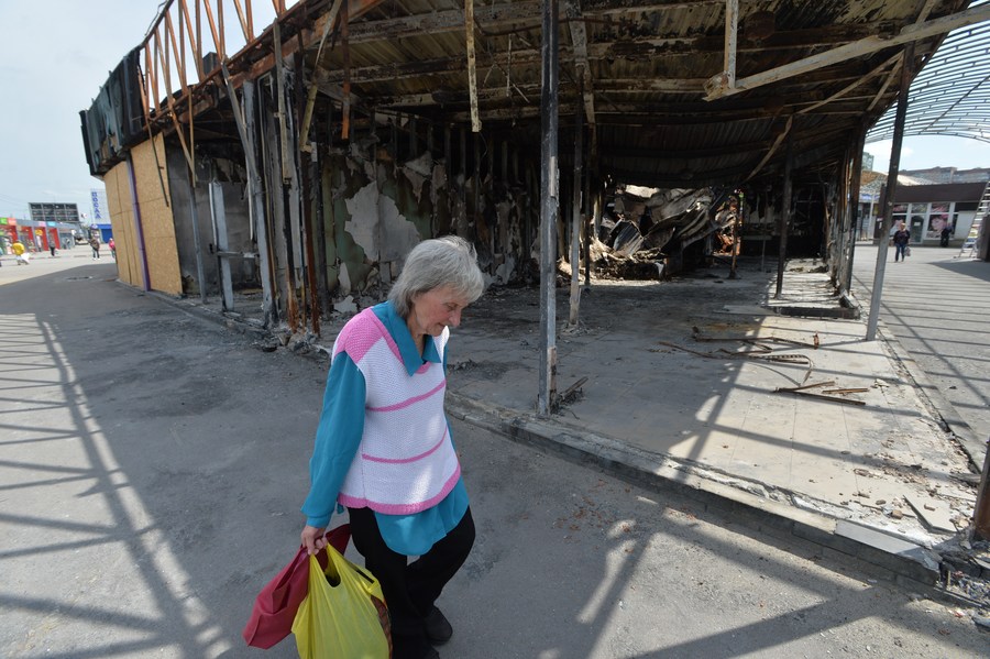 A woman walks past a destroyed shop in Kharkov, Ukraine, June 1, 2022. (Photo by Peter Druk/Xinhua)