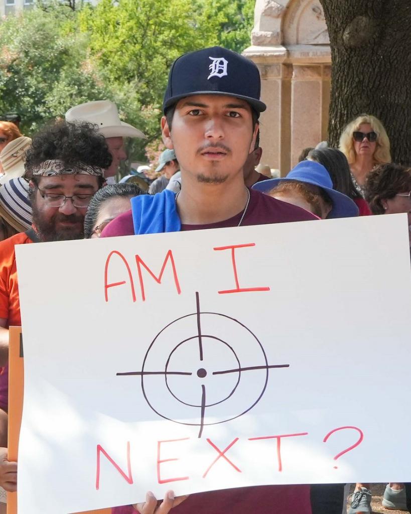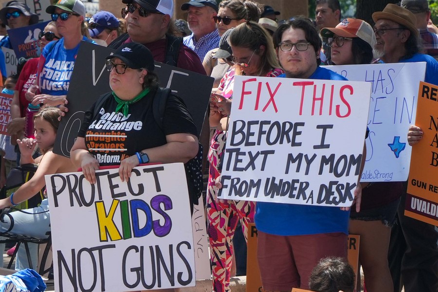 People participate in a demonstration to seek age raise for AR-15 sales in Austin, Texas, the United States, Aug. 27, 2022. (Photo by Bo Lee/Xinhua)