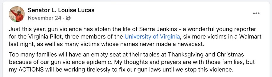 "Too many families will have an empty seat at their tables at Thanksgiving and Christmas because of our gun violence epidemic," Virginia state Senator L. Louise Lucas wrote on Facebook, calling for more action to "stop this violence."