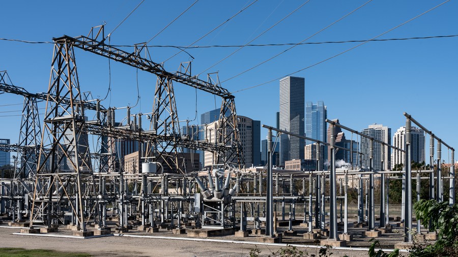 This photo shows an electrical facility in downtown Houston, Texas, the United States, Dec. 23, 2022. (Photo by Chen Chen/Xinhua)