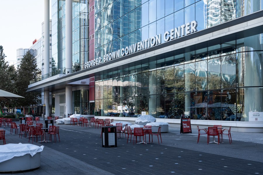 This photo shows the George Brown Convention Center as a warming center in downtown Houston, Texas, the United States, Dec. 23, 2022. (Photo by Chen Chen/Xinhua)