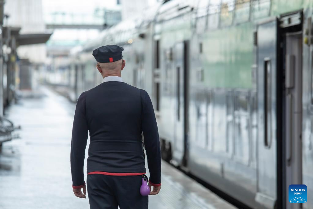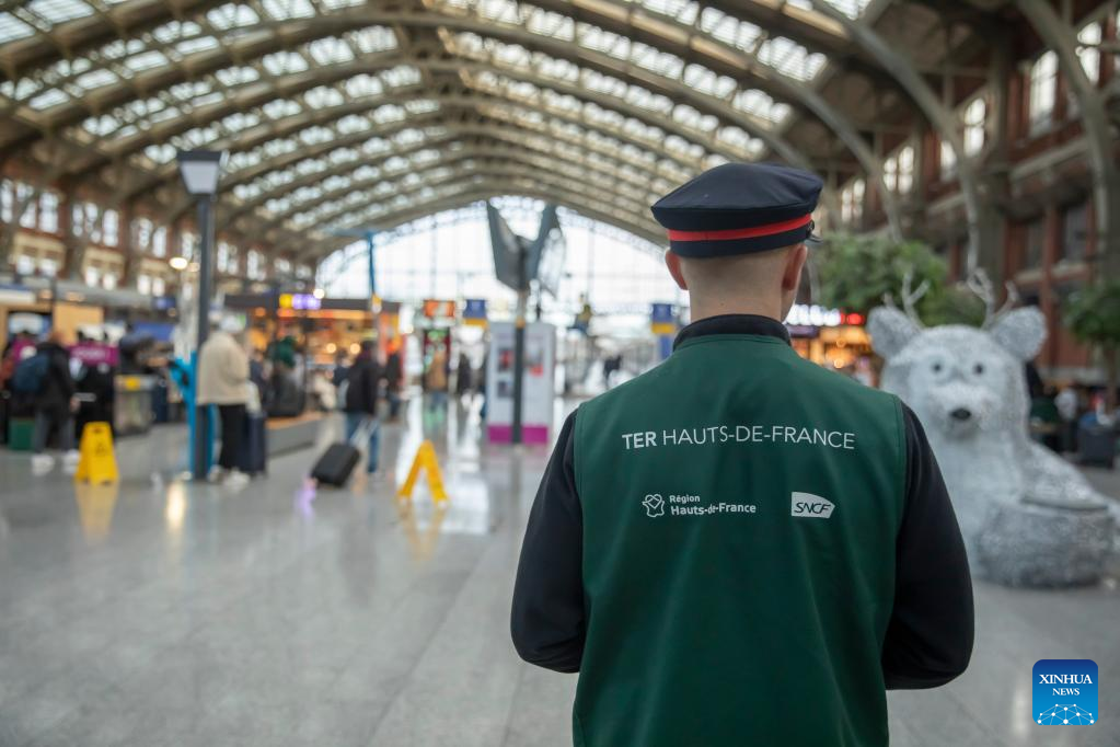 A conductor is seen at Gare Lille Flandres in Lille, northern France, on Dec. 23, 2022. (Photo by Sebastien Courdji/Xinhua)