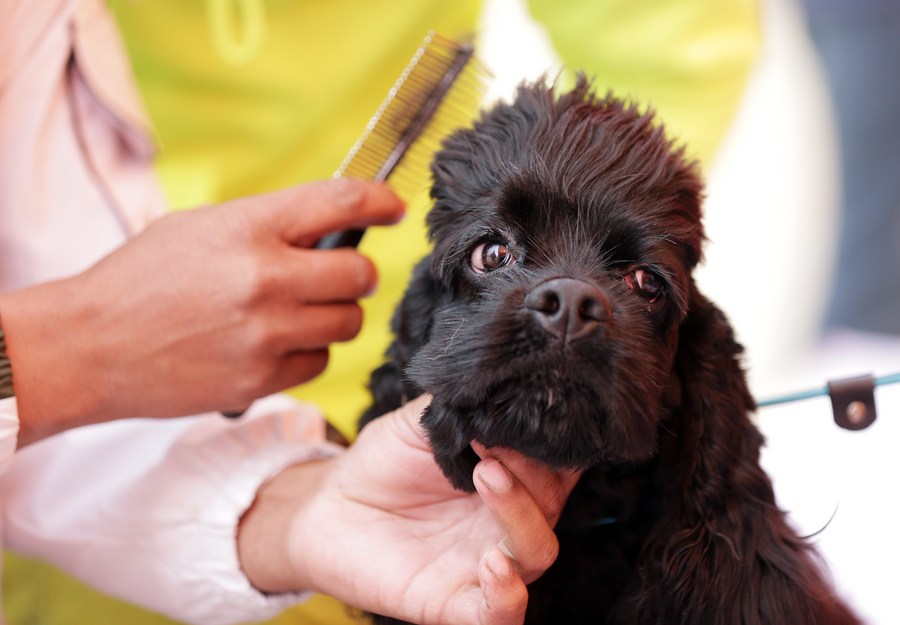 A Cocker Spaniel dog gets groomed by its caretaker during a dog show organized by the Amritsar Canine Club, in Amritsar district of Punjab state, India, on Dec. 24, 2022. (Str/Xinhua)