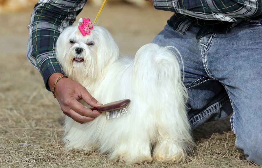 A Maltese dog gets groomed by its caretaker as it prepares to compete during a dog show organized by the Amritsar Canine Club, in Amritsar district of Punjab state, India, on Dec. 24, 2022. (Str/Xinhua)