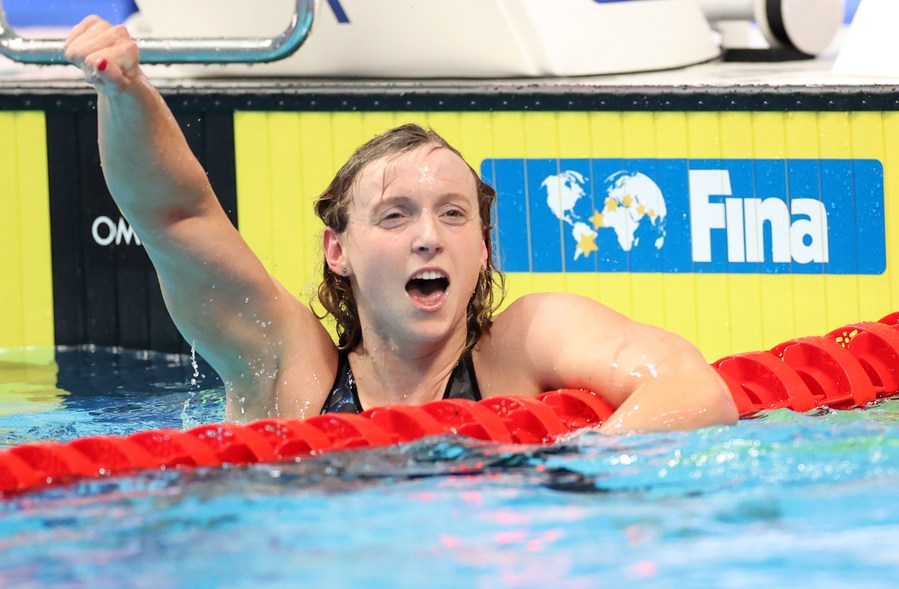 Katie Ledecky of the United States celebrates after the women's 1500m freestyle final at the 19th FINA World Championships in Budapest, Hungary, June 20, 2022. (Xinhua/Li Ying)