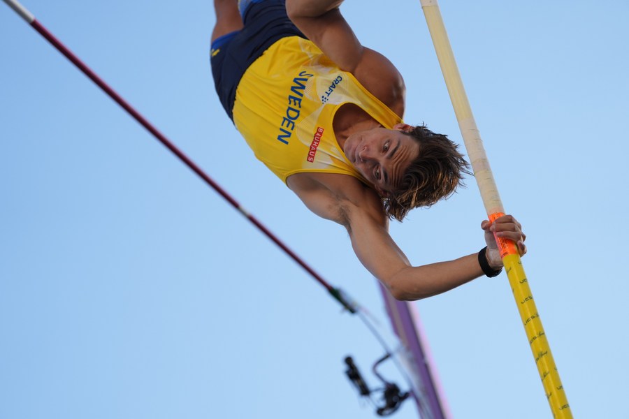 Sweden's Armand Duplantis competes during the men's pole vault final at the World Athletics Championships Oregon22 in Eugene, Oregon, the United States, July 24, 2022. (Xinhua/Wu Xiaoling)