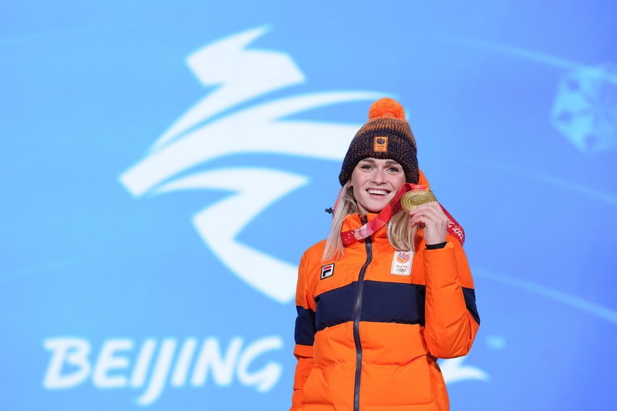 Gold medalist Irene Schouten of the Netherlands poses for a photo during the awarding ceremony of the women's 3,000m speed skating event at the Beijing Medals Plaza of the Winter Olympics in Beijing, capital of China, Feb. 6, 2022. (Xinhua/Ju Huanzong)