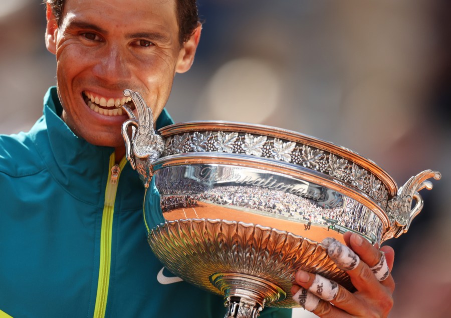 Rafael Nadal of Spain poses with his trophy after winning the men's singles final match against Casper Ruud of Norway at the French Open tennis tournament at Roland Garros in Paris, France, June 5, 2022. (Xinhua/Gao Jing)