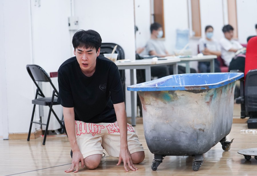 Wang Guang rehearses an avant-garde drama in the rehearsal room of Star Theater in Beijing, capital of China, Sept. 13, 2022. (Xinhua/Chen Zhonghao)