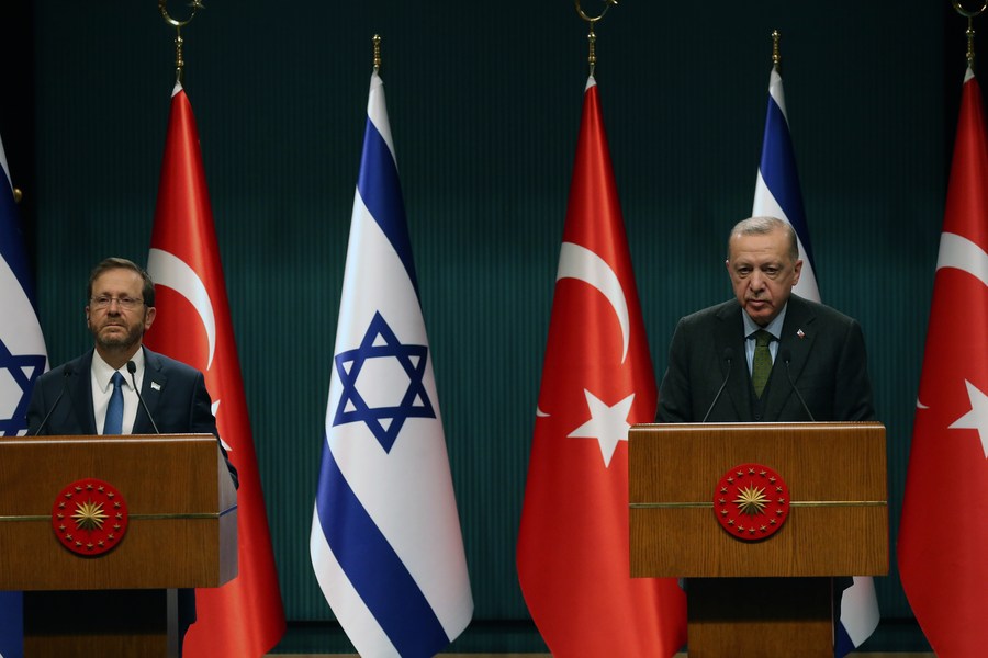 In early March, Erdogan met with visiting Israeli President Isaac Herzog during the latter's ice-breaking visit to Türkiye, in an effort to reset their tense relations due to Türkiye's strong criticism of Israel's policy toward the Palestinians. It was the highest-level Israeli-Turkish meeting held in Turkey in 14 years.