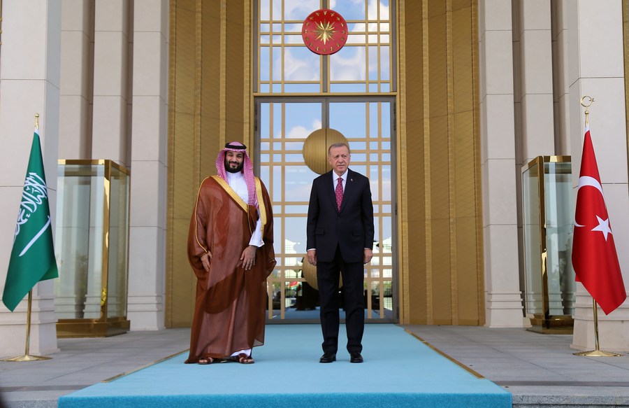 Turkish President Recep Tayyip Erdogan (R) welcomes Saudi Arabia's Crown Prince Mohammed bin Salman Al Saud in Ankara, Turkey, on June 22, 2022. Saudi Arabia's Crown Prince Mohammed bin Salman Al Saud on Wednesday arrived in Ankara to start his first visit to Turkey since the death of the journalist Jamal Khashoggi in 2018. (Photo by Mustafa Kaya/Xinhua)