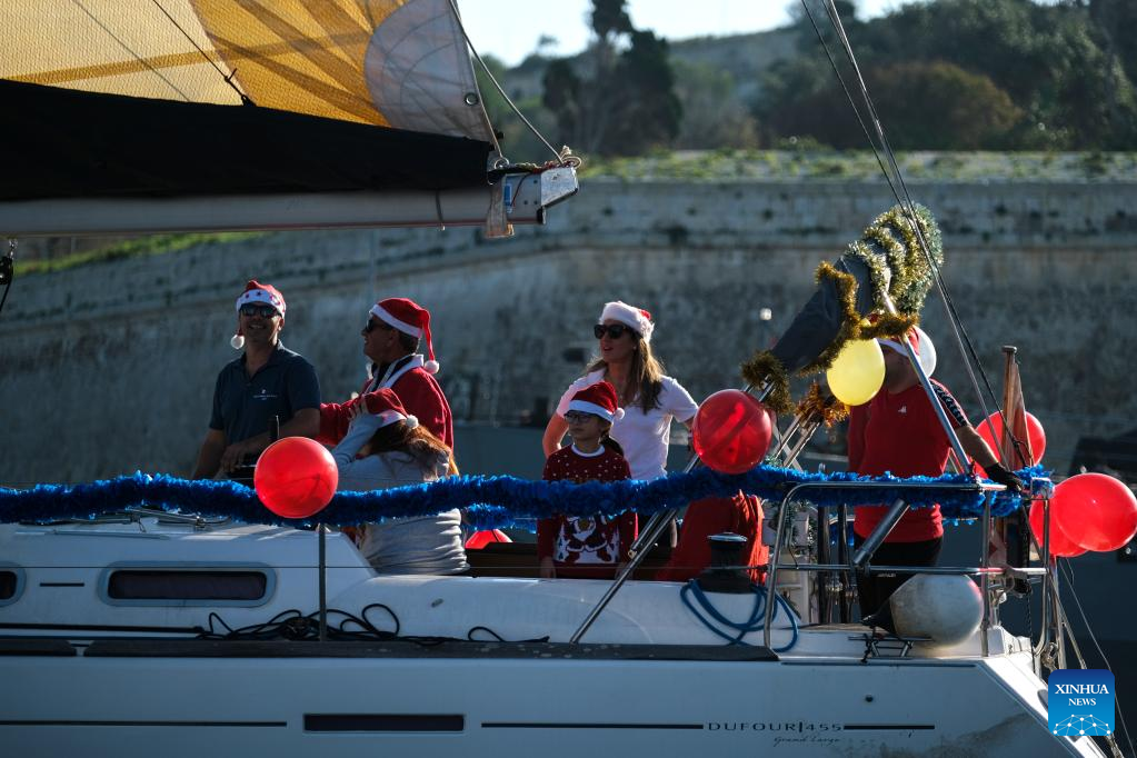 People take part in the traditional Boxing Day Fun Race for charity in Ta' Xbiex, Malta, on Dec. 26, 2022. (Photo by Jonathan Borg/Xinhua)