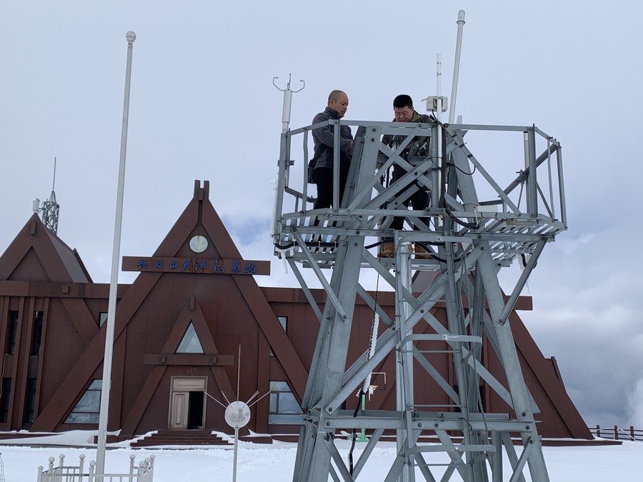 Staff members conduct a check-up on the equipment atop the weather tower at Tianchi meteorological observatory on the main peak of Changbai Mountain in northeast China's Jilin Province, Sept. 23, 2022. (Xinhua)
