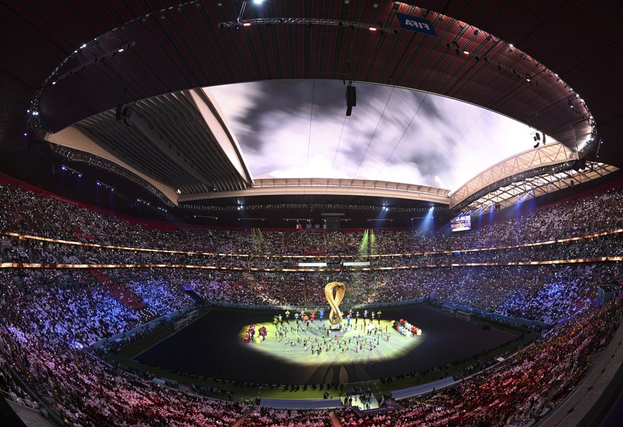 File photo taken on Nov. 20, 2022 shows the general view of the opening ceremony of the 2022 Qatar FIFA World Cup at Al Bayt Stadium in Al Khor, Qatar. (Xinhua/Xiao Yijiu)