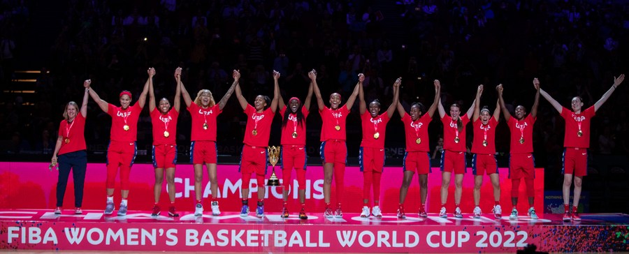 File photo taken on Oct. 1, 2022 shows team USA members celebrate during the awarding ceremony of the FIBA Women's Basketball World Cup 2022 in Sydney, Australia. (Xinhua/Hu Jingchen)