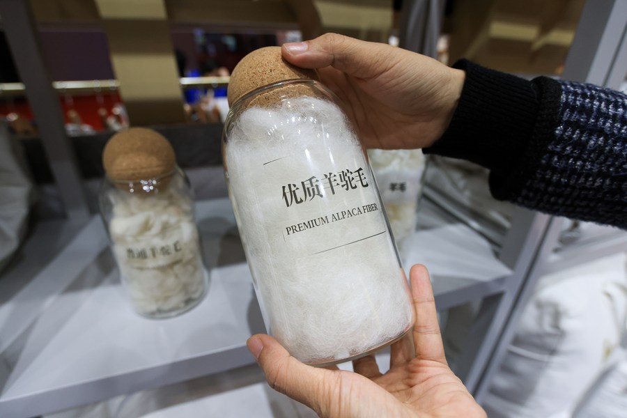 This photo taken on Nov. 7, 2022 shows alpaca fiber at the booth of Pacific Alpacas at the fifth China International Import Expo (CIIE) in east China's Shanghai. Exhibitors from Australia, New Zealand and Peru have displayed alpaca-fur products at the fifth CIIE in Shanghai, attracting many visitors. (Xinhua/Li Jing)