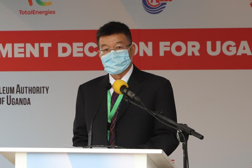 Chen Zhuobiao, China National Offshore Oil Corporation (CNOOC) Uganda president, speaks during a ceremony in Kampala, Uganda, on Feb. 1, 2022. (Xinhua/Zhang Gaiping)