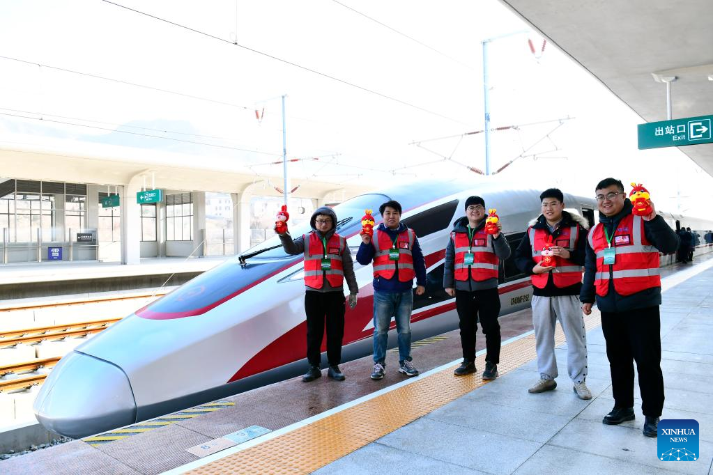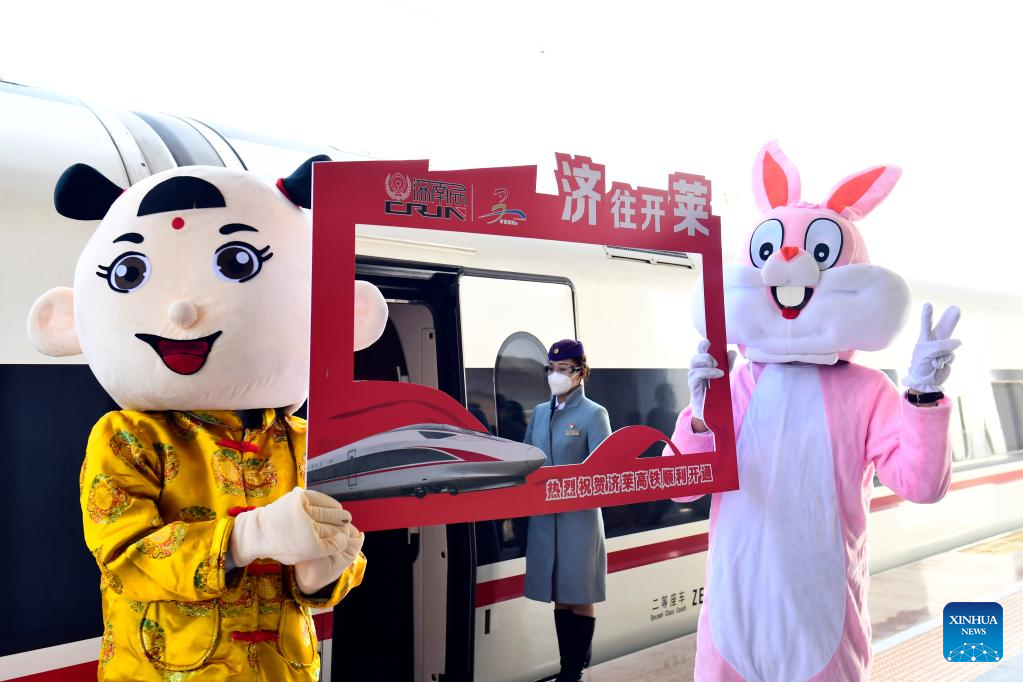 Staff members celebrate the opening of Jinan-Laiwu intra-city high-speed railway at Xueye railway station in east China's Shandong Province, Dec. 30, 2022. The Jinan-Laiwu line, China's first intra-city high-speed railway with a designed speed of 350 km/h, was put into operation on Friday. (Xinhua/Guo Xulei)