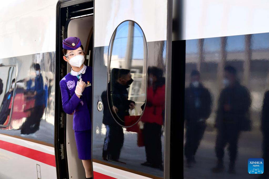 A stewardess is seen at Xueye railway station of Jinan-Laiwu intra-city high-speed railway in east China's Shandong Province, Dec. 30, 2022. The Jinan-Laiwu line, China's first intra-city high-speed railway with a designed speed of 350 km/h, was put into operation on Friday. (Xinhua/Guo Xulei)