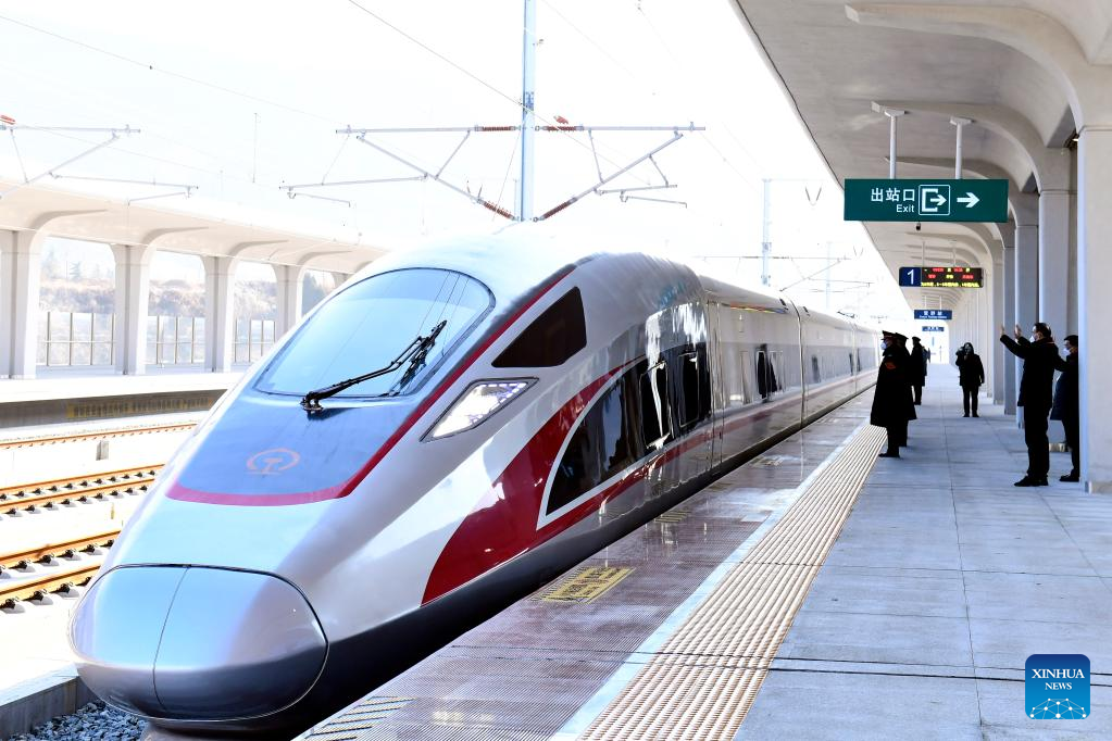 A Fuxing bullet train departs from Xueye railway station of Jinan-Laiwu intra-city high-speed railway in east China's Shandong Province, Dec. 30, 2022. The Jinan-Laiwu line, China's first intra-city high-speed railway with a designed speed of 350 km/h, was put into operation on Friday. (Xinhua/Guo Xulei)