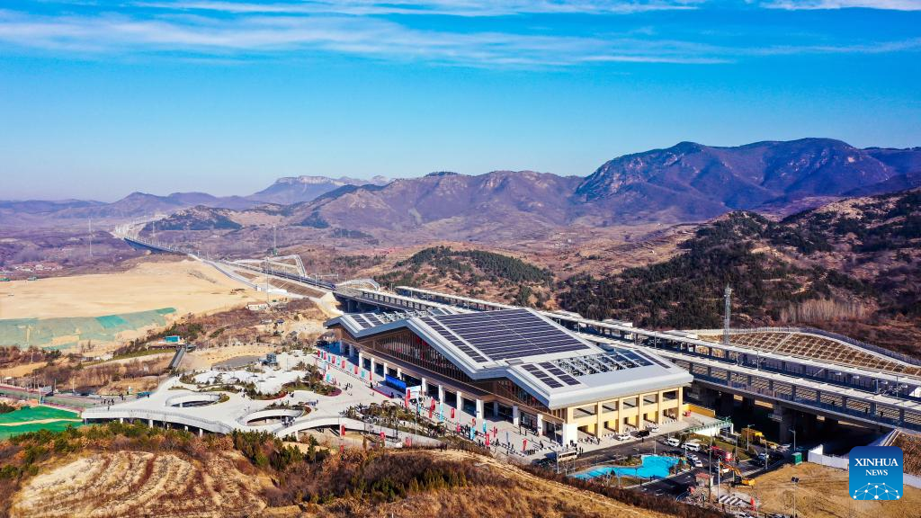This aerial photo taken on Dec. 30, 2022 shows Xueye railway station of Jinan-Laiwu intra-city high-speed railway in east China's Shandong Province. The Jinan-Laiwu line, China's first intra-city high-speed railway with a designed speed of 350 km/h, was put into operation on Friday. (Xinhua/Guo Xulei)