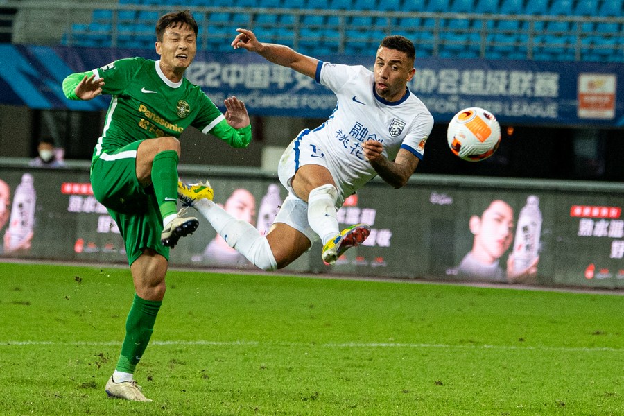 Davidson da Luz Pereira (R) of Wuhan Three Towns shoots during a 2022 season Chinese Super League (CSL) match against Zhejiang FC in Huzhou, east China's Zhejiang Province, Oct. 4, 2022. (Xinhua/Jiang Han)
