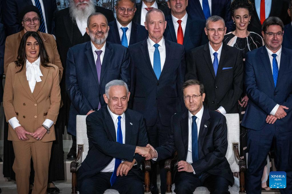 Israeli President Isaac Herzog (R, Front) and Prime Minister Benjamin Netanyahu (L, Front) pose for a group photo with members of the new government at the President's Residence in Jerusalem, on Dec. 29, 2022. Benjamin Netanyahu, the longest-serving Israeli leader, returned to power on Thursday as the country's prime minister at the helm of an extreme-right coalition. (JINI via Xinhua)