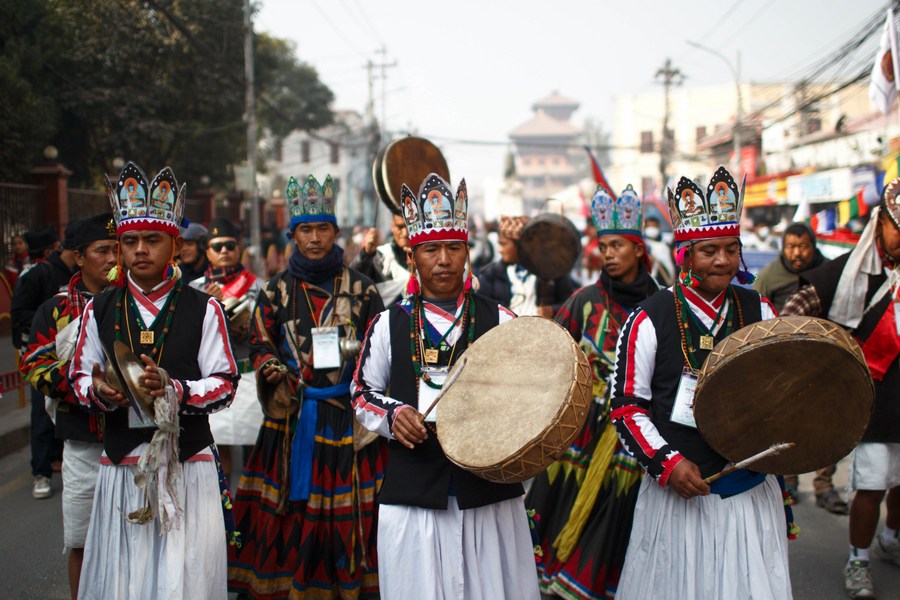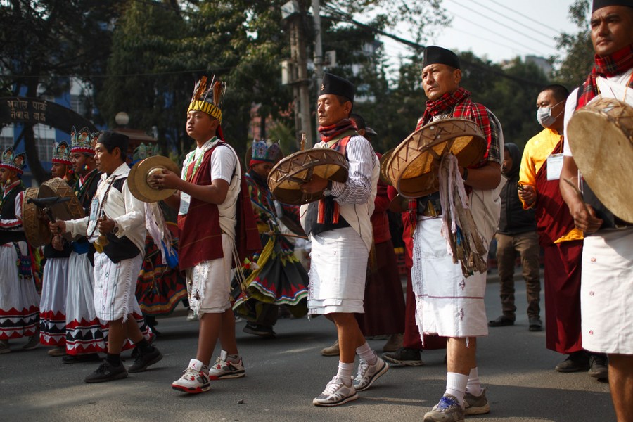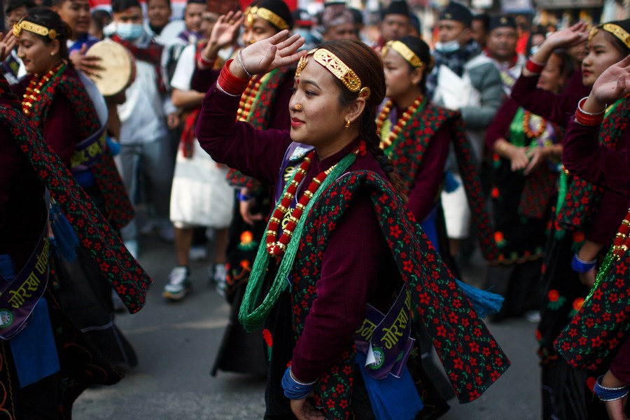 People from the Gurung community in traditional attire take part in a rally to celebrate Tamu Lhosar in Kathmandu, Nepal, on Dec. 30, 2022. (Photo by Sulav Shrestha/Xinhua)