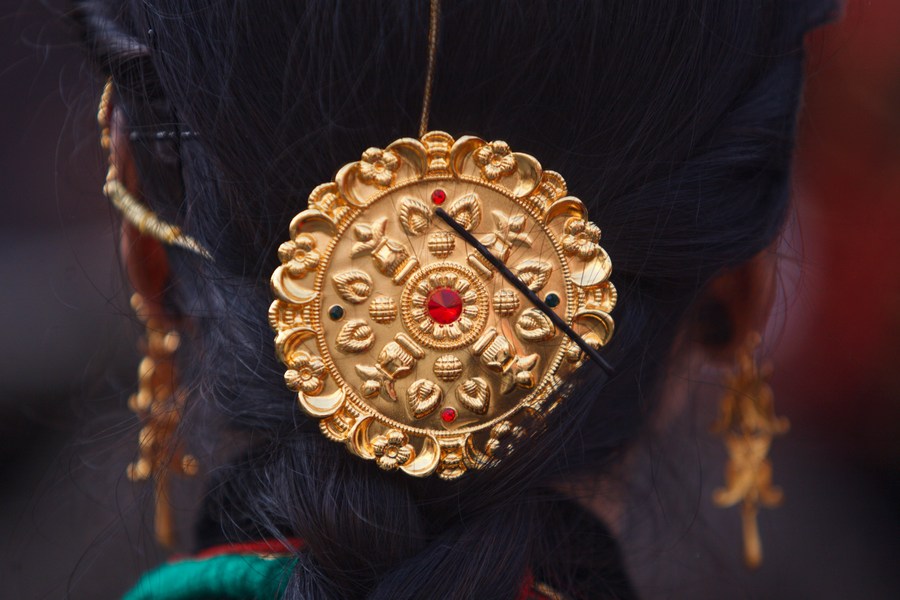An ornament in the hair of a woman from the Gurung community is pictured during a rally organised to celebrate Tamu Lhosar in Kathmandu, Nepal on Dec. 30,2022. (Photo by Sulav Shrestha/Xinhua)■