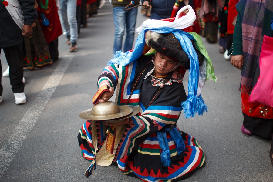 A man from the Gurung community in traditional attire performs during a rally to celebrate Tamu Lhosar in Kathmandu, Nepal, on Dec. 30, 2022. (Photo by Sulav Shrestha/Xinhua)