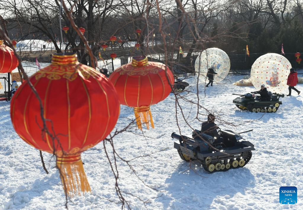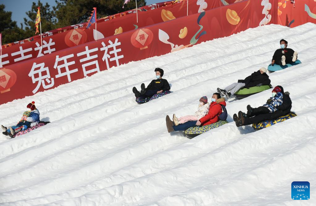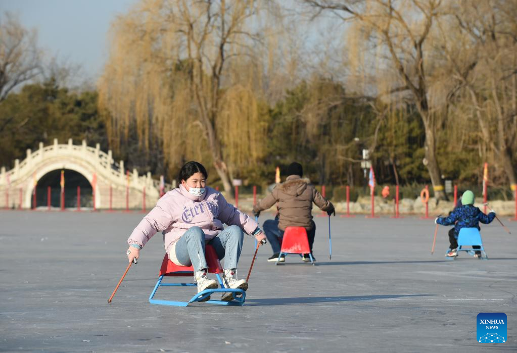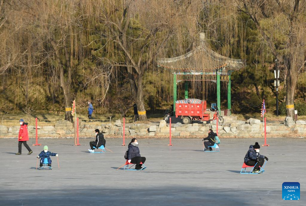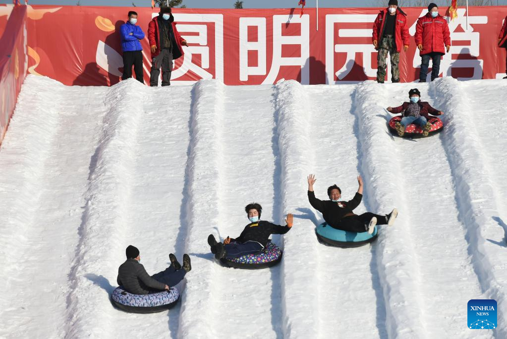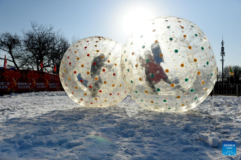 Visitors have fun at Yuanmingyuan Park in Beijing, capital of China, Dec. 31, 2022. The ice and snow festival of Yuanmingyuan Park kicked off on Saturday. (Xinhua/Luo Xiaoguang)