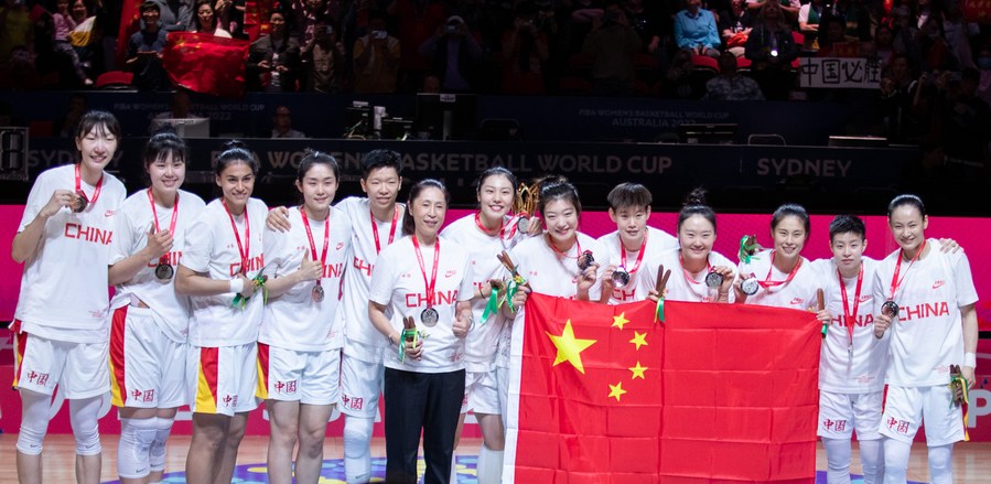 Team China members celebrate during the awarding ceremony of the FIBA Women's Basketball World Cup 2022 in Sydney, Australia, Oct. 1, 2022. (Photo by Hu Jingchen/Xinhua)