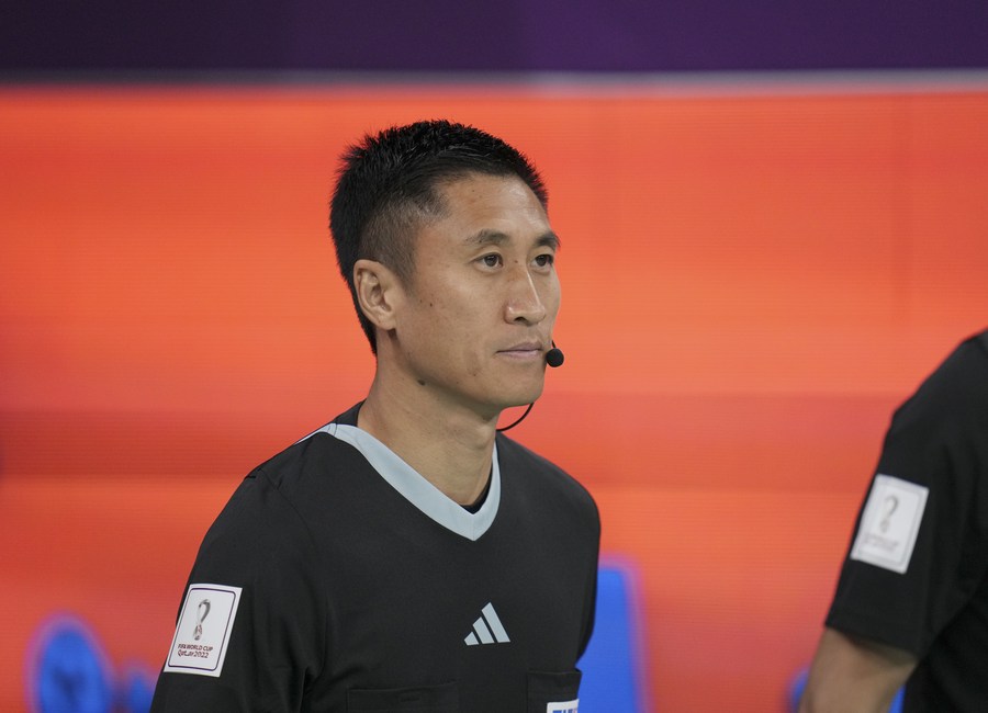 Fourth official Ma Ning reacts prior to the Group A match between the Netherlands and Qatar at the 2022 FIFA World Cup at Al Bayt Stadium in Al Khor, Qatar, Nov. 29, 2022. (Xinhua/Meng Dingbo)