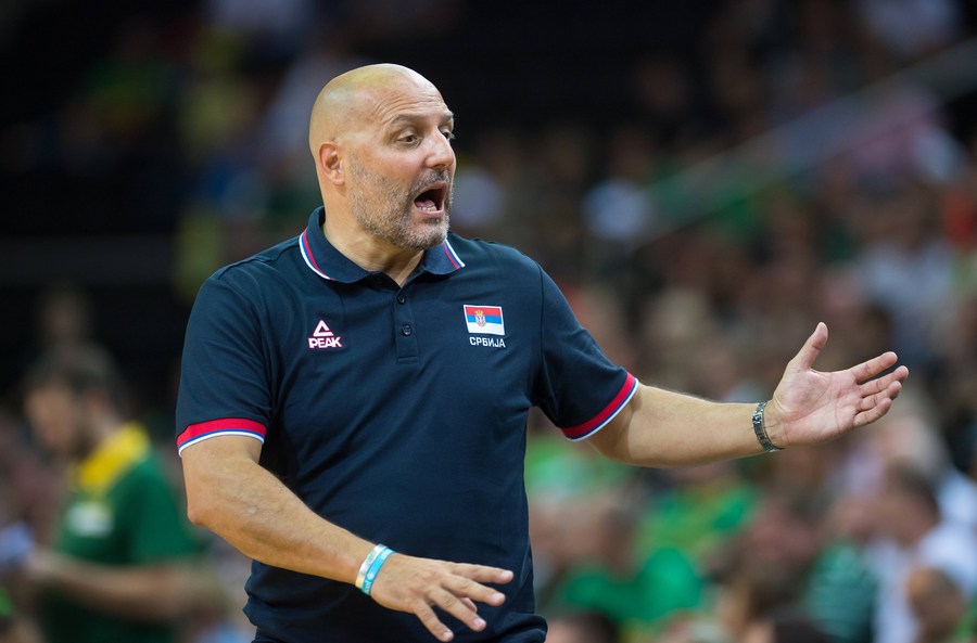 Serbia's head coach Aleksandar Djordjevic reacts during a friendly basketball match between Lithuania and Serbia in Kaunas, Lithuania, Aug. 12, 2019. (Xinhua/Alfredas Pliadis)