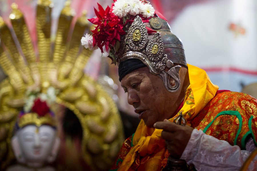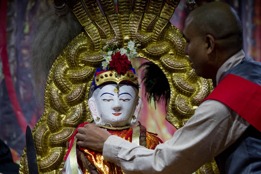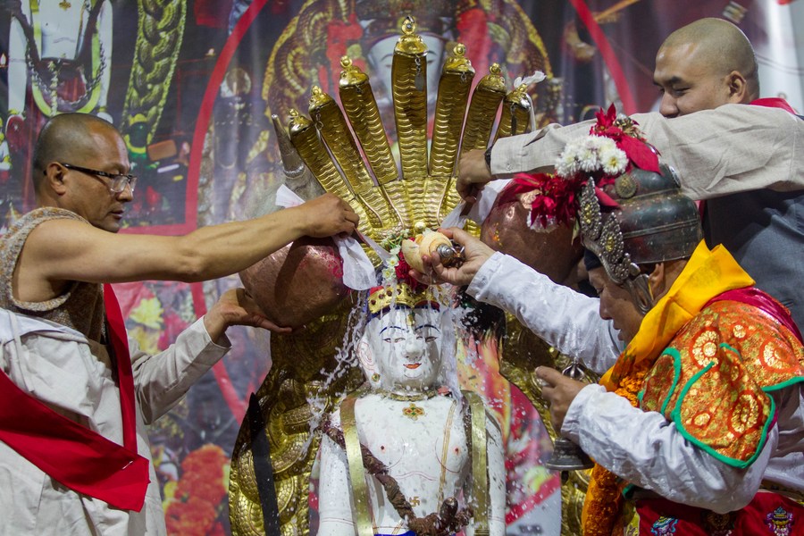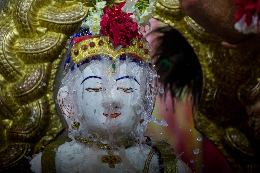 Priests perform a bathing ritual of God Seto Machhindranath in Kathmandu, Nepal on Dec. 30, 2022. (Photo by Sulav Shrestha/Xinhua)
