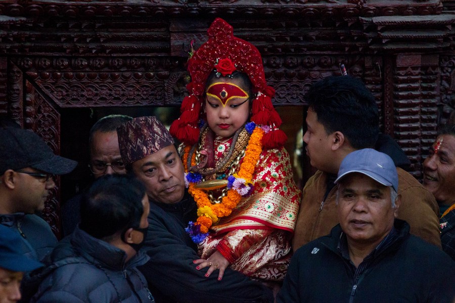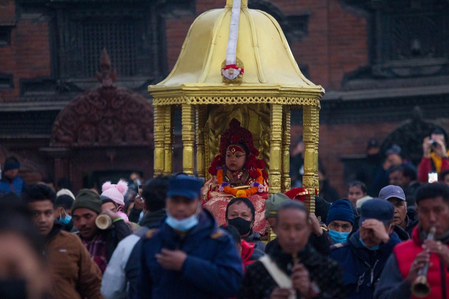 Living Goddess Kumari is carried from the Kumari house to observe the bathing ritual of God Seto Machhindranath in Kathmandu, Nepal on Dec. 30, 2022. (Photo by Sulav Shrestha/Xinhua)