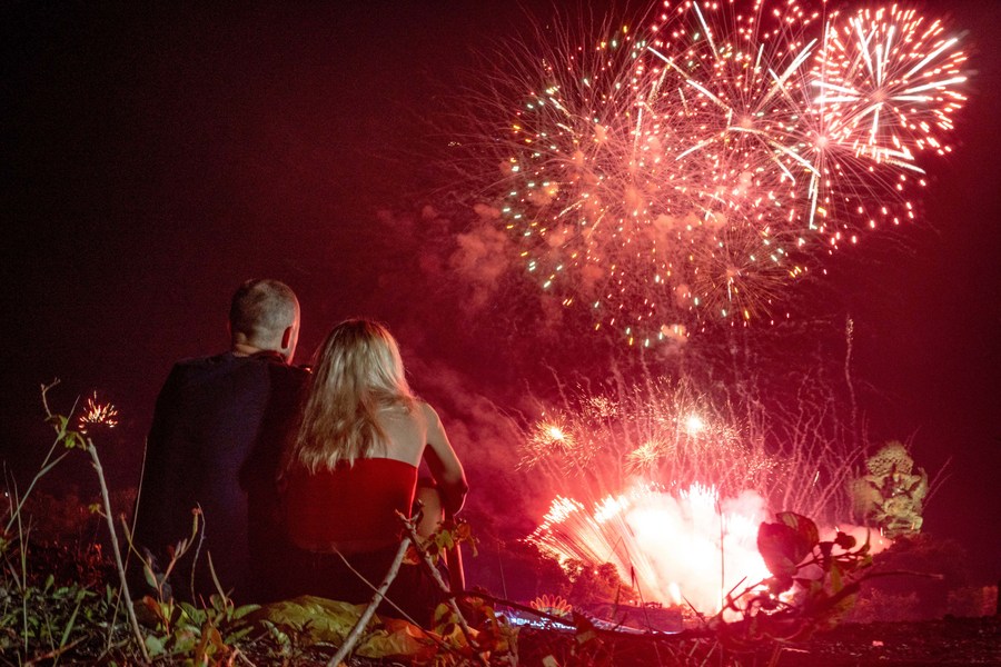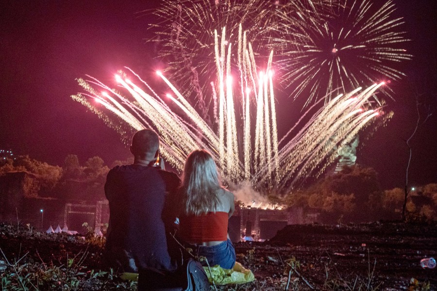 People watch fireworks during the New Year's Eve celebration at Garuda Wisnu Kencana Cultural Park in Bali, Indonesia, Dec. 31, 2022. (Photo by Dicky Bisinglasi/Xinhua)