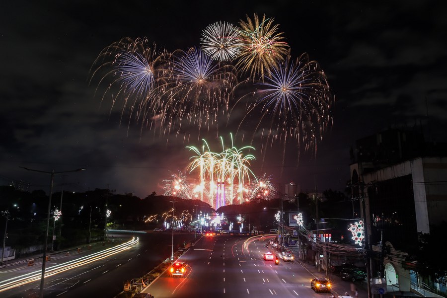 Fireworks light up the sky during the New Year celebrations in Quezon City, the Philippines, Jan. 1, 2023. (Xinhua/Rouelle Umali)