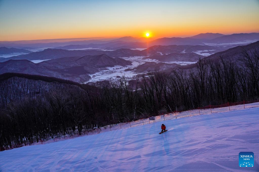 A skier skis at the Lake Songhua Resort in Jilin City, northeast China's Jilin Province, Jan. 1, 2023. (Xinhua/Yan Linyun)