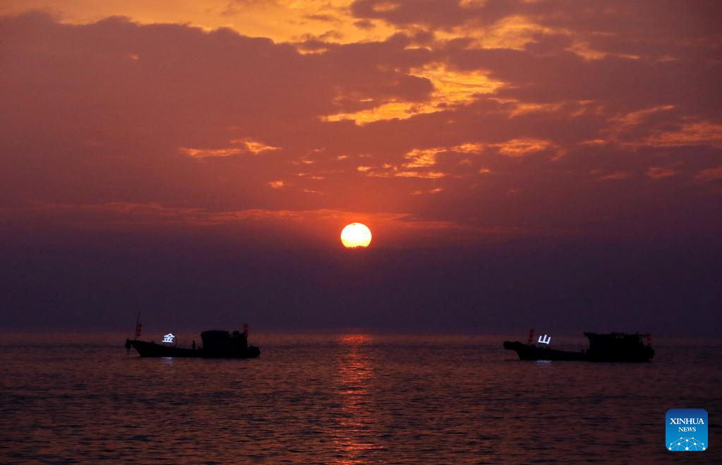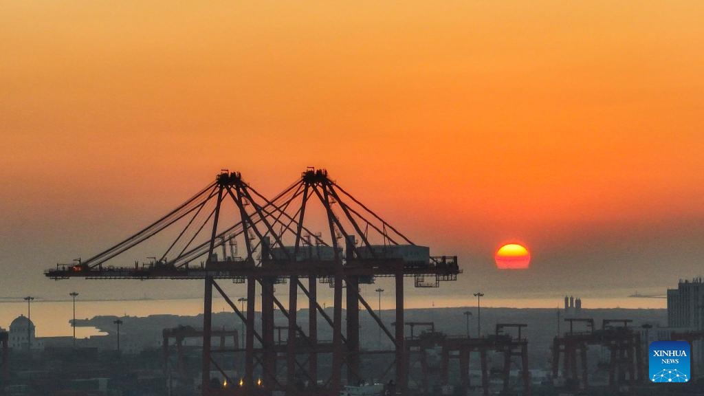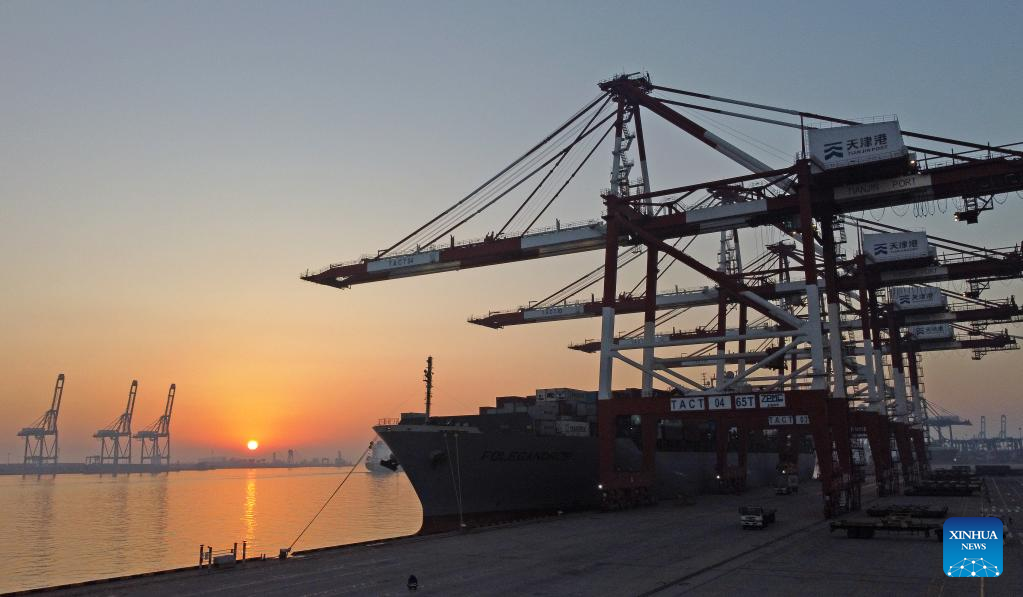 This photo taken on Jan. 1, 2023 shows the sunrise scenery at the Tianjin Port in north China's Tianjin. (Xinhua/Zhao Zishuo)